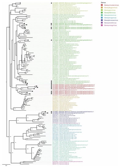 Placement of 18 novel genomoviruses into the phylogenetic context of other viruses clustering to the family Genomoviridae. The phylogenetic tree was built based on the Rep protein multiple sequence alignment (aa), which was produced using mafft (v7.45) [30]. The sequences evaluated in the most recent taxonomic update of the family Genomoviridae [27] were downloaded from GenBank and used as context (n = 109). Newly identified viruses are marked with black dots, and genera are color-coded. Saturated node support values are shown with asterisks (*). The phylogenetic tree was constructed using iqtree v1.6 [35] with 1,000 UFBootstrap replicates [37] and the phylogenetic model LG+F+R9. Tree visualization was facilitated using Figtree v1.4.4 (https://github.com/rambaut/figtree.git, accessed on 25 September 2021), and the tree was rooted at midpoint.