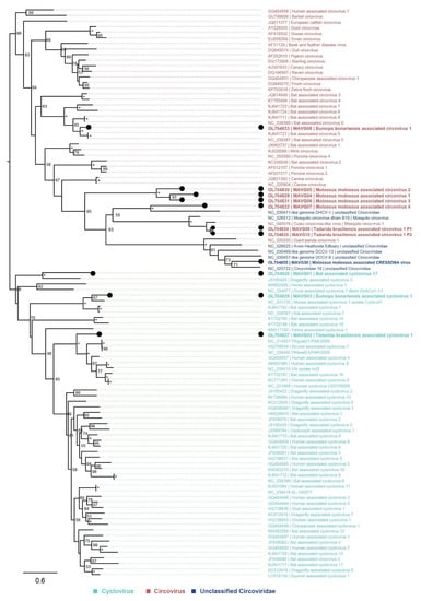 Placement of six novel circoviruses, three novel cycloviruses, and one novel circo-like virus into the phylogenetic context of other viruses clustering to the family Circoviridae. The phylogenetic tree was built based on the Rep protein multiple sequence alignment (aa), which was produced using mafft (v7.45) [33]. Context sequences were downloaded from the ICTV Circoviridae data resource (https://talk.ictvonline.org/cfs-file/__key/communityserver-wikis-components-files/00-00-00-00-83/OSD.Cir.Fig1A.Cyclovirus_5F00_circovirus_5F00_reps_5F00_aln_5F00_ed.fas, 25 September 2021). In addition, the first three most similar RefSeq sequences according to blastn searches not yet present among the primary ICTV sequences were added to the database of context sequences (n = 90). Newly identified viruses are marked with black dots, and genera are color-coded. Saturated node support values are shown with asterisks (*). The phylogenetic tree was constructed using iqtree v1.6 [35] with 1000 UFBootstrap replicates [37] and the phylogenetic model LG+F+R9. Tree visualization was facilitated using Figtree v1.4.4 (https://github.com/rambaut/figtree.git, accessed on 25 September 2021), and the tree was rooted in such a way that the two genera, Circovirus and Cyclovirus, were monophyletic.