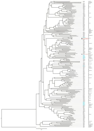 - Nguyen, L.-T.; Schmidt, H.A.; von Haeseler, A.; Minh, B.Q. IQ-TREE: A fast and effective stochastic algorithm for estimating maximum-likelihood phylogenies. Mol. Biol. Evol. 2015, 32, 268–274. [Google Scholar] [CrossRef]