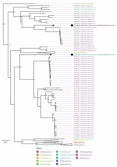 Placement of two novel anelloviruses into the phylogenetic context of other viruses clustering to the family Anelloviridae. The phylogenetic tree was built using the ORF1 multiple nucleotide sequence alignment (nt), which was produced using mafft (v7.453) [33]. The anellovirus sequences evaluated in the most recent taxonomic update [29] were downloaded from GenBank and used as context (n = 987). Newly identified viruses are marked with black dots, and genera are color-coded. Iota-, Alep-, Rho-, and Kappatorquevirus genera were collapsed. Saturated node support values are shown with asterisks (*). Only a subtree with the 312 most relevant context sequences, rooted using the sequence MF187212, is shown. The phylogenetic tree was constructed using iqtree v1.6 [35] with 1000 UFBootstrap replicates [37] and the phylogenetic model GTR+F+R4, which was chosen as the best-fitting model according to the Bayesian information criterion using ModelFinder [36]. Tree visualization was facilitated using Figtree v1.4.4 (https://github.com/rambaut/figtree.git, accessed on 25 September 2021).