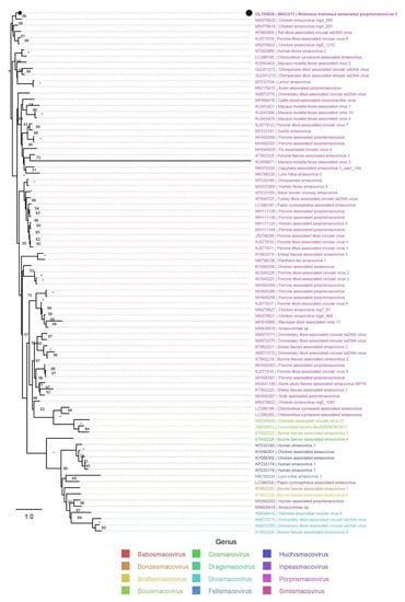 Phylogenetic analyses of potentially novel genomoviruses and smacoviruses, and novel viruses of the family Circoviridae, were based on the Rep protein multiple sequence alignments. The amino acid multiple sequence alignment of the Rep40 proteins was used to phylogenetically position the potentially novel parvoviruses, whereas a multiple nucleotide sequence alignment of the ORF1 gene was used for the phylogenetic analysis of the potentially novel anelloviruses. The context sequences used for phylogenetic analyses of the potentially novel genomoviruses (ncontext sequences = 109), smacovirus (ncontext sequences = 84), and anelloviruses (ncontext sequences = 987) were selected based on the most recent relevant taxonomical updates [24,25,26] and downloaded from GenBank. Context sequences for phylogenetic reconstruction and placement of the potentially novel parvovirus (ncontext sequences = 56) and viruses belonging to the family Circoviridae (ncontext sequences = 90) were downloaded from the relevant ICTV resource pages (https://talk.ictvonline.org/ictv-reports/ictv_online_report/ssdna-viruses/w/parvoviridae/1055/resources-parvoviridae, accessed on 1 September 2021 and https://talk.ictvonline.org/cfs-file/__key/communityserver-wikis-components-files/00-00-00-00-83/OSD.Cir.Fig1A.Cyclovirus_5F00_circovirus_5F00_reps_5F00_aln_5F00_ed.fas, accessed on 1 September 2021). In addition, in the case of Circoviridae, the first three most similar RefSeq sequences according to blastn searches not yet present among the primary ICTV sequences were added to the database of context sequences.
