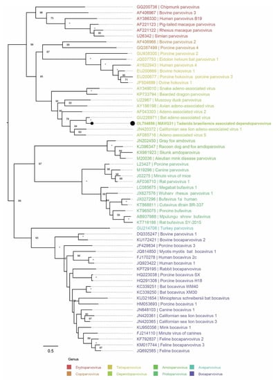 Placement of the novel parvovirus into the phylogenetic context of other viruses clustering to the subfamily Parvovirinae. The phylogenetic tree was built using the NS1 protein multiple sequence alignment; as suggested by the most recent relevant taxonomic update [47], the Rep40 protein subsequence was used in the case of the novel parvovirus (aa). The multiple sequence alignment was produced using mafft (v7.453) [33]. Context sequences were downloaded from the ICTV official resource page for the subfamily Parvovirinae (https://talk.ictvonline.org/ictv-reports/ictv_online_report/ssdna-viruses/w/parvoviridae/1055/resources-parvoviridae; 25 September 2021; n = 59). The black dot marks the newly identified virus. Saturated node support values are shown with asterisks (*). The phylogenetic tree was constructed using iqtree v1.6 [35] with 1000 UFBootstrap replicates [37] and the phylogenetic model rtREV+F+I+G4, which was chosen as the best-fitting model according to the Bayesian information criterion using ModelFinder [36]. Tree visualization was facilitated using Figtree v1.4.4 (https://github.com/rambaut/figtree.git, accessed on 25 September 2021), and the tree was rooted at midpoint.