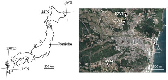 Sampling was carried out from sites around Tomioka, Fukushima, Japan (Figure 1). Two samples of groundwater (GW1 and GW2) were collected from wells and spring ponds. River water (RW) was collected from a tributary of the Tomioka river. Water samples were collected using sterilized polypropylene bottles (1 L volume) on 17 November 2020 and stored at 4 °C until further analysis. Water pH and oxidation-reduction potential (ORP) were measured in the field using portable meters (WQ-320J, HORIBA, Kyoto, Japan) at four points, as shown in Figure 1.
