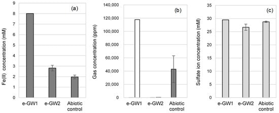 Corrosion activity in enriched cultures after 2 months of cultivation. (a) Fe(II) concentration after iron dissolution by corrosion, (b) gas contents in the headspace (gray bar (CH4), white bar (H2)), and (c) sulfate ion concentration in culture medium.