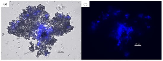 Microscopic observation of enriched culture (e-GW1) overlayed with auto-fluorescence of methanogens (a) and auto-fluorescence of methanogens (b).