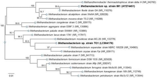 Genomic DNA was extracted from the culture of isolated methanogen by using DNeasy PowerSoil Pro Kit (QIAGEN, Venlo, Netherland). The 16S rRNA gene of isolated methanogen was amplified using extracted genomic DNA with primer sets, Arch f2/Arc r1386 for, as previously described []. The amplified 16S rRNA gene was sequenced using the Sanger sequencing method (performed at FASMAC Co., Ltd., Kanagawa, Japan). The identified sequence of the isolate was deposited in DNA Data Bank of Japan under accession number LC664176. The related methanogens to the obtained sequence of the isolate were estimated by using the BLASTn algorithm against the sequences in the GenBank database available from the National Center for Biotechnology Information. Alignment and phylogenetic reconstructions of strain TO1 among other species of Methanobacterium and Methanothermobacter thermoautotrophicus strain delta H (NR_042782) as an out-group were performed using the function “build” of ETE3 v3.1.1 [] as implemented on the GenomeNet (https://www.genome.jp/tools/ete/ (accessed on 28 December 2021)). A phylogenetic tree was constructed using FastTree [].