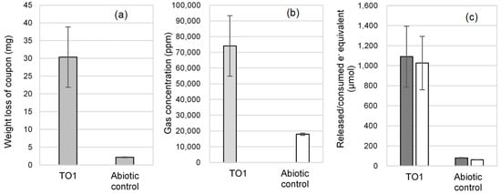Corrosion activity of strain TO1 after 2 months of cultivation: (a) weight loss of carbon steel coupon, and (b) gas content in the headspace (light gray bar (CH4), white bar (H2)); (c) electron balance between electrons released from iron oxidation (dark gray bar) and electrons consumed by gas (CH4 and H2) generation (white bar).