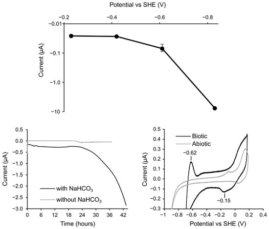 (a) Cathodic current production after electrical incubation for 110 h poised at different potentials with −0.23V, −0.42V, −0.61V, and −0.83V vs SHE in the presence of NaHCO3. An error bar represents standard deviation from two individual experiments. (b) Amperogram of cathodic current generation in the presence and absence of NaHCO3 at −0.85V vs SHE. (c) Cyclic voltammograms after electrical incubation at −0.83V vs SHE in the presence and absence of cells.