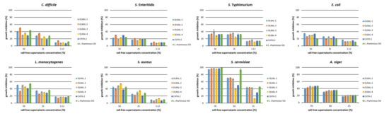 Similar results were also observed for A. niger. In specific, at concentration 50% and 70% of neutralized CFSs, 30–35% and 40–47% inhibitory activity, respectively, was observed, and at lower concentrations, antifungal activity was reduced, in accordance with previous studies [42,43].