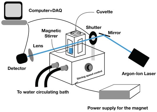 Schematic of the experimental setup used to measure the optical density, OD, of bacteria in real time is shown in Figure 2. Light from an Argon-Ion laser (Spectra Physics, Santa Clara, CA, USA) of wavelength 488 nm is guided using a mirror into the sample chamber through a shutter. The shutter is controlled using a data acquisition device (DAQ) (National Instruments, Austin, TX, USA) and is only opened during the intensity measurement to avoid continuous exposure of bacterial cells to the laser. The sample chamber is equipped with a magnetic stirring system and the rate of stirring can be controlled using a control knob. Teflon coated magnetic stirrers for cuvettes were purchased from SP Bel-Art, PA, USA. A light intensity to frequency converter photodiode (AMS-TAOS, Plano, TX, USA) is used to measure the forward scattered light intensity using the DAQ. The light intensity thus measured is converted into optical density as described in the text. The temperature of the sample holder is controlled using a water circulating bath. Our experimental setup allows us to measure the optical density of the cell culture in real time without interruption.
