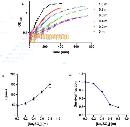 (A) Linear-log plot of the growth curves of E. coli at different concentrations of Na2SO4. (B) Biomass doubling time, , of bacteria as a function of salt concentration. The biomass doubling time, , is calculated by fitting exponential curves through the data points (shown as solid lines in A) in the exponential growth phase. (C) Survival fraction of bacteria as a function of Na2SO4 concentration.