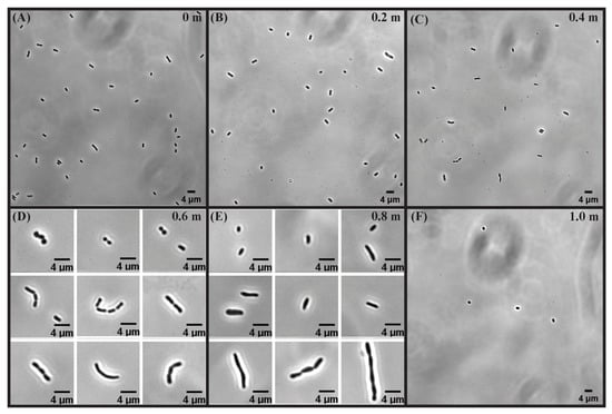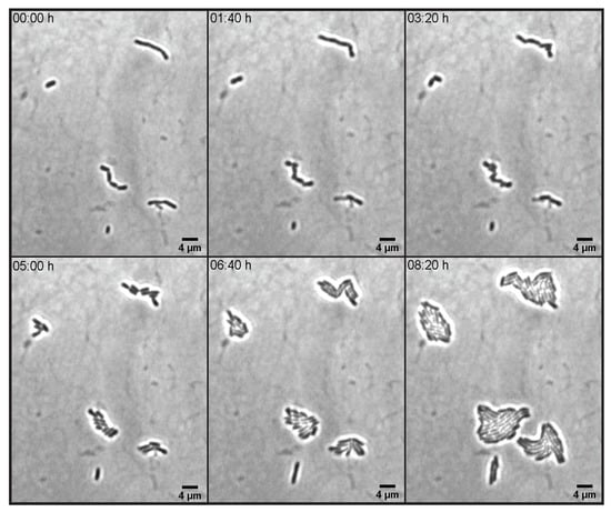 After examining the changes in the morphology of the bacterial cells under different concentrations of sodium sulfate, we then questioned whether the effects of sodium sulfate on E. coli are permanent. For this, we look at the changes in the morphology of the cells after the salt stress is removed. The cells were cultured in m Na2SO4 to OD. The sample for imaging was prepared by adding a small sample (≈1 ) of cells grown at m Na2SO4 to a thin LB-agar chamber (without Na2SO4). Time-lapse images of cell growth and division were obtained at room temperature (≈23 C). Figure 7 shows an image sequence of the bacterial cells acquired over 500 min. We find that all the cells were able to go back to the morphology of the control cells after a few generations. A reversibility of the cell morphology movie from the time-lapse images is provided in the Supplementary Materials (Video S1).
