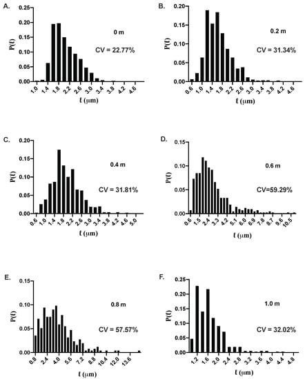 Probability distribution function, , of cell length, ℓ, for Na2SO4 concentrations: (A) 0 m, (B) m, (C) m, (D) m, (E) 0.8 m, and (F) m. The cell length distribution exhibits large heterogeneities at high concentrations of sodium sulfate. For m Na2SO4, the bacterial cells do not exhibit any growth, and the cell length becomes smaller, presumably due to water efflux. Coefficient of variation (CV) of the probability distributions for all the salt concentrations are also shown.