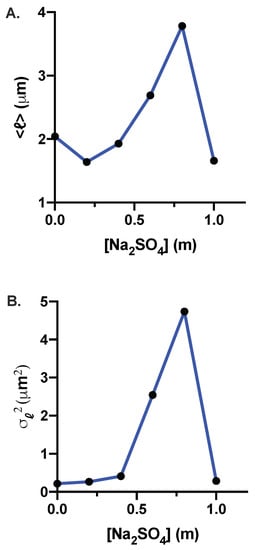 (A) Average cell length, , as a function of sodium sulfate concentration. decreases slightly at m and m, then it increases monotonically between m and m, and becomes smaller at m Na2SO4. (B) Variance of the cell length, , as a function of sodium sulfate concentration. The variance increases monotonically with Na2SO4 concentration up to m.