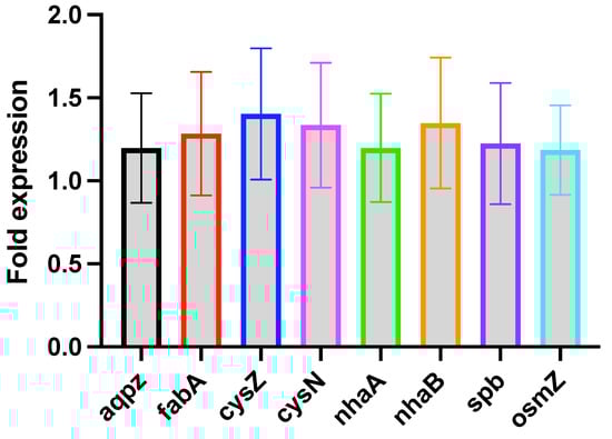Comparative expression of various genes involved in water transport (aqpZ), sodium transport (nhaA, nhaB), sulfate transport (cysZ, sbp), sulfate metabolism (cysN), a global transcriptional regulator (osmZ), and fatty acid production (fabA). We do not find significant changes in the expression of these genes ( at high salt concentration during the exponential growth phase. cysZ and nhaB exhibit slight upregulation within the error bar. However, this is not conclusive from our data due to large error bar with the .