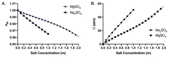 (A) Water activity, , and (B) osmotic pressure, , as a function of concentration of aqueous solutions of sodium and magnesium sulfate at T = 37 C, computed using the Pitzer model.
