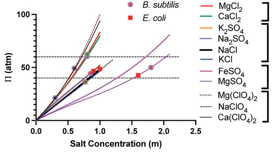 Osmotic pressure, , as a function of concentration of aqueous solutions of various salts at T = 37 C, computed using the Pitzer model. We also show the osmotic pressures corresponding to the limiting salt concentrations of growth of E. coli and B. subtilis.