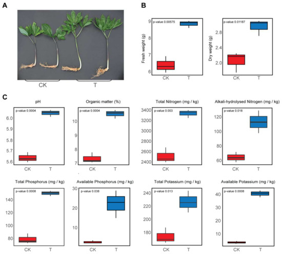 Effect of a bioorganic fertilizer application on P. notoginseng fresh and dry weights, root and shoot lengths, and soil physicochemical properties. (A) Representative images of P. notoginseng plants grown in soils without (CK) and with (T) a bioorganic fertilizer. (B) P. notoginseng plants fresh weight, dry weight, shoot length and root length. (C) Comparison of soil physicochemical properties between bioorganic fertilizer and non-fertilizer treatments. Whiskers in the red and blue box represent the range of minimum and maximum values within a control and bioorganic fertilizer treatment, respectively.