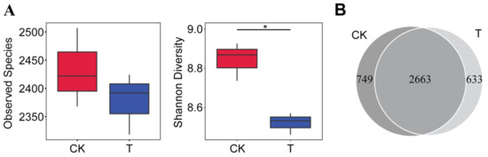 Bioorganic fertilizer alters bacterial community alpha diversity. (A) Alpha diversity of rhizosphere bacterial community in the bioorganic fertilizer (T) and no-fertilizer (CK) treatments. Whiskers in the red and blue box represent the range of minimum and maximum alpha diversity values within a control (CK) and bioorganic fertilizer (T) treatment.The bacterial diversity values were considered significantly different between treatments when the p-value < 0.05 (* p < 0.05). (B) Venn diagram of OTUs detected in the bioorganic fertilizer and no-fertilizer treatments.