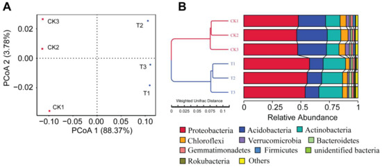 Next, we performed a principal coordinate analysis (PCoA) based on the weighted UniFrac distance to observe changes in the rhizosphere bacterial community structure (Figure 3A). The bacterial community inhabiting the rhizosphere of P. notoginseng grown in the bioorganic fertilizer amended soils was clearly separated from the control treatment. Both treatments separated along the axis 1, and the first coordinate of PCoA 1 explained a maximum variation of 88.37% in the bacterial β-diversity. The observed differences in β-diversity were mainly explained by the change in the proportion of dominant bacterial phyla inhabiting the rhizosphere (Figure 3B). These results indicate that the application of the bioorganic fertilizer had a significant effect on the rhizosphere community.