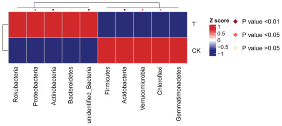 Phylogenetic evolutionary tree of rhizosphere bacterial microbiota at the genus level from the bioorganic fertilizer and no-fertilizer treatments. Different colors of the branches represent different phyla. The relative abundance of each genus displayed outside the circle with orange (T, bioorganic fertilizer) and red color (CK, no-fertilizer).