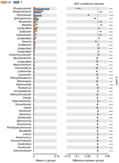 Covering the phylum to genus level, the genera that significantly changed in abundance after adding the bioorganic fertilizer were identified using the Welch’s t-test. The relative abundance of several bacterial genera including, Rhodanobacter, Arthrobacter, Sphingomonas, Devosia, Pseudolabrys, Luteimonas, Lysobacter, Nitrosospira and Nakamurella increased in the rhizosphere of Sanqi ginseng grown in soils amended with the bioorganic fertilizer. In contrast, the abundance of bacterial genera Bradyrhizobium, Bryobacter, Massilia, Solibacter, and Udaeobacter increased in the non-fertilizer treatment (Figure 6). Most of the bacterial genera abundant in the bioorganic fertilizer treatment were also positively correlated with the soil physicochemical properties (Figure S2).