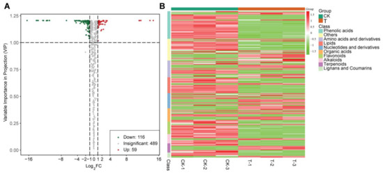 Differentially abundant soil metabolites in bioorganic (T) and no-fertilizer (CK) treatments. (A) Volcano plot showing numbers of significantly enriched metabolites in bioorganic fertilizer (red circles) and no-fertilizer (green circles) treatments. (B) Heat map representing various metabolites classes detected from bioorganic and no-fertilizer treatments.
