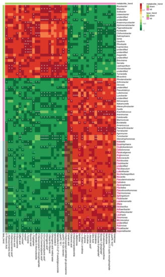 Heatmap based on Spearman’s correlation index values between differential microbial taxa and metabolites responding to bioorganic fertilizer and no fertilizer treatments in the rhizosphere. Correlation were considered significant when the p-value < 0.05 (* p < 0.05, ** p < 0.01).