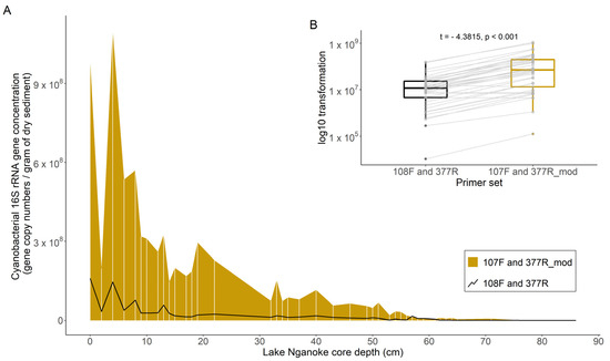 (A) Differences in cyanobacterial 16S ribosomal RNA gene copy numbers between the primer set CYAN108F and CYAN377R [41] and the primer set developed in this study (CYAN107F and CYAN377R_mod) when applied to sedimentary DNA extracted from a sediment core from Lake Nganoke. White vertical lines show sample depths. (B) A paired t-test was run on the log-transformed data and the results are displayed in the inset. The y-axis is the same as for (A), cyanobacterial 16S rRNA gene concentration, but with a log10 transformation.