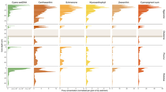 In general, there were moderately strong positive relationships between the cyanobacterial 16S rRNA gene and cyanopigment concentrations but differences among lakes. A recent study evaluated a range of cyanobacteria species and reported differences in the relative concentrations of individual cyanopigments [36]. In particular, picocyanobacteria (Synechococcaceae) contained lower relative concentrations of echinenone than other cyanobacteria, and bloom-forming genera such as Dolichospermum and Microcystis contained lower relative concentrations of zeaxanthin. Differences in the cyanobacterial community over time were evident in Lake Pounui, where echinenone was more abundant than myxoxanthophyll in the top of the core, and in Lake Rototoa where myxoxanthophyll was more abundant from the middle of the core. These types of shifts in specific cyanopigments have been well documented in other lakes in the literature [21,24,25] and have been theorized to be associated with changes in the cyanobacterial community.