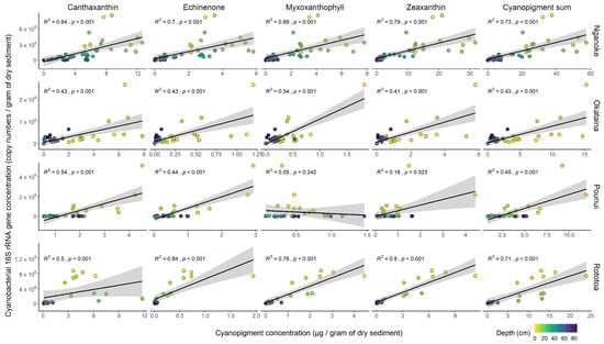 Relationships across lakes between cyanobacterial 16S rRNA gene concentrations (gene copy numbers per gram of dry weight of sediment) from droplet digital PCR data and concentrations of individual cyanopigments and total cyanopigments from high-performance liquid chromatography (µg per gram of dry weight of sediment). Relationships (R2) and p-values calculated using Spearman’s correlation test are displayed, colour gradient shows the depth of each core sub-sample.