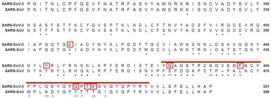 Analysis and comparison of mutations in the RBD of SARS-CoV-2 and SARS-CoV. The RBD of the SARS-CoV-2 (NCBI reference sequence: YP_009724390.1) spike protein was aligned with the closest related human βCoV, SARS-CoV (NCBI reference sequence: AYV99817.1). The PrDs of SARS-CoV-2 are red. Different residues are denoted by * beneath the consensus position. The amino acids asparagine (Q) and glutamine (N) in the PrDs of the SARS-CoV-2 RBD that differ from the amino acids in the SARS-CoV RBD are denoted by a red ** beneath the consensus position. Amino acids of the SARS-CoV-2 RBD that bind to ACE2 are marked with red boxes. RBD—receptor-binding domain.