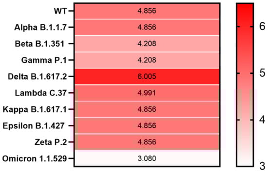 Compared with that of SARS-CoV-2 WT, we observed an elevated LLR score for the S protein from only the Delta (B.1.617.2) variant, with the LLR of 6.025, while from the emerging Omicron (B.1.1.529), the LLR was only 3.080 (Figure 3 and Supplementary Figure S4).