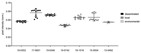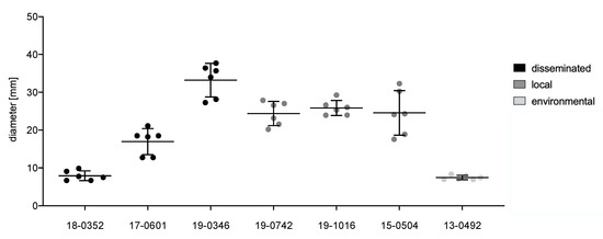 Urease activity of Cryptococcus neoformans var. neoformans isolates from disseminated infections (black), localized soft tissue infections (grey), and the environment (light grey). A total of 5 µL containing 106 cells were spotted on Christensen’s urea agar and incubated at 30 °C for 48 h. Halos surrounding colonies were measured digitally. Black lines show means with standard deviation of three biological replicates with two measurements each.