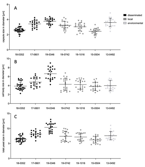 Capsule (A), cell body (B) and total cell size (C) of Cryptococcus neoformans var. neoformans isolates from disseminated infections (black), localized soft tissue infections (grey), and the environment (light grey). Cells were incubated in minimal medium at 30 °C for 24 h. Cells were stained with India ink and measured digitally. Black lines show means with standard deviation of 20 measured cells per isolate. Dots show individual data points.
