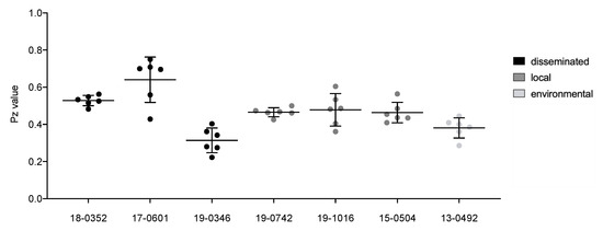 3.4. Median Survival of G. mellonella Larvae Varies Significantly between Isolates