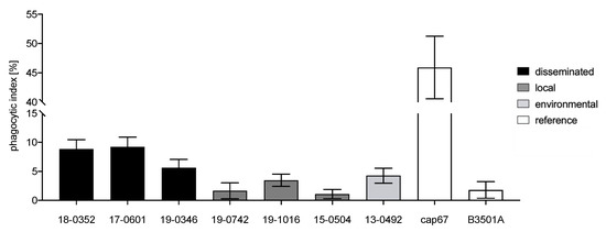 Cryptococci isolated from disseminated infections showed a significantly higher mean phagocytic index as compared to isolates from localized soft tissue infections (7.9 vs. 2.1%; p < 0.0001). The environmental isolate resulted in a phagocytic index between cells from disseminated and localized cells.