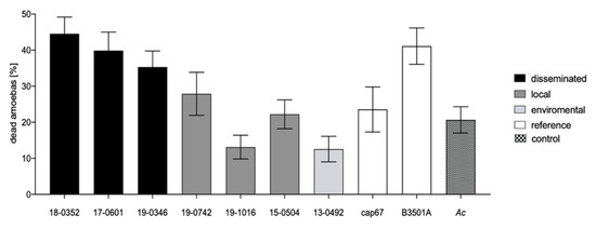 Taken together, cells from disseminated infections showed higher cytotoxicity for amoeba than isolates from localized infections (40% vs. 21%; p < 0.0001).