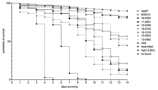 C. neoformans var. grubii H99 showed the highest virulence in G. mellonella and C. neoformans var. neoformans cap67 the lowest (median 4 vs. 17 days; Figure 7). Infection with clinical and the environmental C. neoformans var. neoformans strains showed median survival between 6 and 13.5 days (p = 0.0047) with all isolates being less virulent than H99. The environmental isolate resulted in a median survival of 10 days.