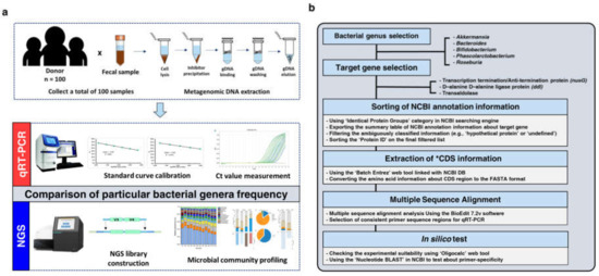 Figure 1. Experimental introduction in this study and schematic workflow of a genus-specific primer design method for qRT-PCR assay. Using stool samples obtained from 100 healthy adults, we performed a comparative analysis to evaluate the accuracy of microbial quantification by two different molecular technologies. (a) The overall experimental workflow of the qRT-PCR assay and NGS-based 16S V3-V4 metagenome sequencing. (b) Schematic diagram showing the process to design the genus-specific primer set to quantify the proportions of the five selected bacterial genera within each sample using qRT-PCR.