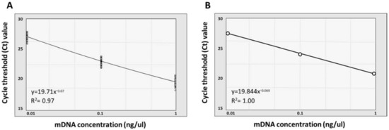 Figure 2. Standard curve calculation to confirm normalization of the mDNA concentration used for qRT-PCR analysis. Each double-stranded mDNA sample diluted with a three step 10-fold serial dilution (10−1, 10−2, and 10−3) was standardized at 10 ng/μL for standard curve calculation. The graph’s x-axis indicates the concentration of each 10-fold diluted mDNA used in standard curve calculation, and the y-axis shows the Ct value measured from the qRT-PCR. (A) Standard curve graph representing the Ct value of every sample with 10-fold serially diluted mDNA concentration (R2 = 0.97). (B) Standard curve graph representing the average Ct value of each concentration of the diluted mDNA sample (R2 = 1.00).