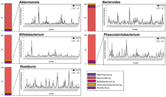 We compared the relative bacterial proportion similarity of the five genera within the human gut microbial community between the qRT-PCR assay using formerly normalized 100 mDNA samples (10 ng/μL per sample) and the NGS-based 16S metagenome profiling data (Figure 3 and Figure 4, Table 3, Supplementary Tables S5 and S6). In order to compare both approaches, we distributed quantitative figures using a formula of 1/2^Ct to measure the potential bacterial frequency of genus within each sample based on the Ct values exported by qRT-PCR analysis (Shown in Supplementary Table S6; [51]).