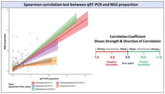 Results of statistical analysis confirmed that the Spearman correlation values for all bacterial genera groups were significantly calculated (p-value < 0.05; Spearman’s rho value > 0.5). Considering that the Spearman analysis evaluates statistically positive similarity if the correction value (Spearman’s rho value) is 0.4 or higher, we could confirm that the relative bacterial proportion measured with NGS is similar to that measured with qRT-PCR assay [52]. Our comparative results showed that the five genus-specific primer pairs had high-binding sensitivity and specificity for the target mDNA.