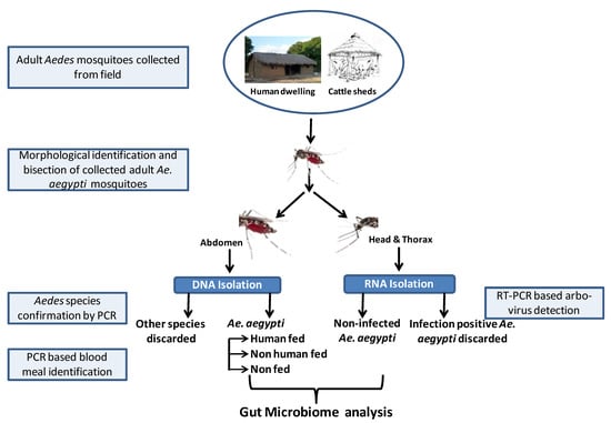 Mosquitoes are unquestionably the most studied groups of insects with public health importance due to their involvement in the transmission of several diseases. Globally, 80% of the population is at the risk of one or more vector-borne diseases (VBD) [1], accounting for more than 17% of all infectious diseases and causing approximately 1 million deaths annually. The maintenance and transmission of the pathogens causing malaria, lymphatic filariasis, and numerous viral infections such as dengue virus (DENV), chikungunya virus (CHIKV) and the recent Zika virus (ZIKV) outbreak is absolutely dependent on the availability of competent mosquito vectors and their intrinsic capability to feed on human blood [2]. Mosquitoes’ blood-feeding habit not only provides them with critical blood proteins and nutrients for egg production and reproductive fitness, but it also allows pathogens to establish themselves in and be transmitted to humans by their arthropod hosts [2,3]. Therefore, both blood-feeding behavior and blood meal host preference are critical as an increased biting rate leads to an increased vectorial capacity wherein the vector has more chances to acquire and spread pathogens [4]. However, studies have revealed that the blood quality, and thus host species, can alter reproductive output, suggesting that disease vectors have a specialized blood-feeding behavior [5]. The fact that most disease-causing agents transmitted by mosquitoes are host-specific (Plasmodium falciparum, Plasmodium vivax, Wuchereria bancrofti, DENV) indicates that their survival is largely dependent on their ability to transmit from one individual to another, which is aided by mosquito vectors. It was also observed that specific host species contribute disproportionately to pathogen transmission due to differences in number, exposure, and susceptibility to infection [6]. The intensity and peak timing of West Nile Virus (WNV) infection rates in the Northern house mosquito Culex pipens pipens, which was predominantly driven by its exclusive preference for feeding on Turdus migratorius (American robin), demonstrated the same [7]. Therefore, host selection patterns of blood-feeding arthropods are important determinants of epidemiological dynamics for vector-borne diseases, and they are generally applied to understand the natural transmission dynamics, predict disease risk, and inform disease surveillance and control efforts. The impact of vector host-feeding choices on arthropod gut microbial communities is a critical yet unexplored aspect that has the ability to change vector-borne disease dynamics. Some bacterial species present in the mosquito gut were reported to influence a variety of biological and physiological features, including mosquito longevity and insecticide susceptibility [8,9], reproductive fitness [10] and can modulate vectorial capacity [11,12,13,14] in disease vectors such as Anopheles and Aedes. Many factors, such as developmental stage, larval environment, arthropod host species, sex, pathogen infection and exposure to external chemicals, such as pesticides and antibiotics, can alter the composition of gut microbial communities of mosquito disease vectors [15,16,17,18,19].