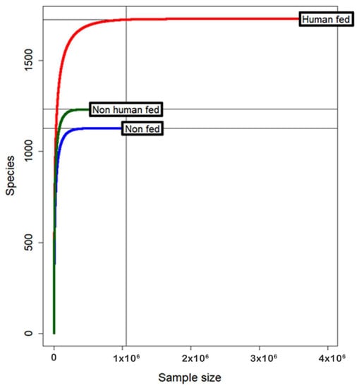 R version 3.3.2 [36] (https://cran.r-project.org/bin/windows/base/old/3.2.3/ accessed on 3 December 2021) was used for statistical analyses. The alpha-diversity metrics, including the Shannon and Simpson diversity index and observed OTUs (richness) were computed using the “vegan” package in R [37]. The “vegan” package was used to construct rarefaction curves to determine the sequencing coverage for each group of mosquitoes. Within and between-group differences in relative abundance of bacterial taxa were tested using Kruskal–Wallis (with post hoc Dunn test) and Wilcoxon rank-sum tests. A p-value < 0.05 was considered statistically significant. α-diversity indices and bacterial abundance between different groups were compared using one-way analysis of variance (ANOVA) followed by Dunn’s post hoc analysis and Bonferroni p-value corrections. Non-metric multidimensional scaling (NMDS) with Bray–Curtis similarity matrix values was conducted using the “vegan” package to assess the β-diversity and the NMDS plot was used to characterize within-group and between-group differences in bacterial communities. Stress values were used to assess the quality of NMDS representation; stress values <0.2 are considered a good representation of the data and those >0.3 are not considered to be valid [25]. The permutational multivariate analysis of variance (PERMANOVA) test with 9999 permutations was conducted in PAST v.3.14 [38] to determine the intra-group statistical differences of β-diversity. Differences in the microbial communities that were strongly associated with each blood-feeding behavior, was assessed using LEfSE (linear discriminatory analysis [LDA] effect size) to identify the unique bacterial taxa that drive differences between each of the groups [39] in the MicrobiomeAnalyst server [40]. Linear discriminant analysis (LDA) score threshold 2.0 and a p-value cut off at 0.05 were used. To remove technical bias related to different sequencing depths in different libraries, total sum scaling (TSS) normalization method was used in the MicrobiomeAnalyst server [40].