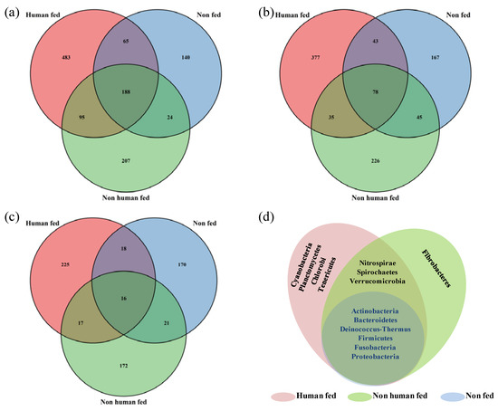 Venn diagrams showing the overlap of bacterial operational taxonomic units among human-fed, non-human-fed and non-fed mosquitoes (a) Species, (b) Genus, (c) Family and (d) Phylum.