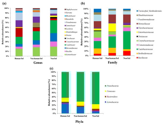 Relative abundance of most abundant bacterial taxa associated with human-fed, non-human-fed and non-fed mosquitoes (a) Genus, (b) Family and (c) Phyla.