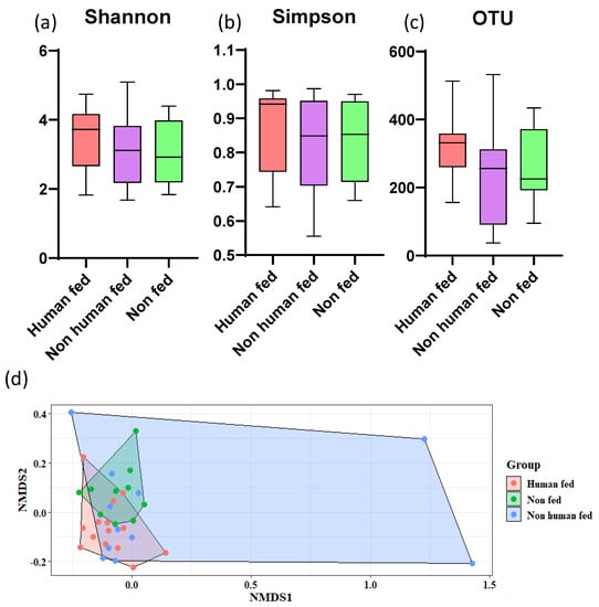 Distinct gut microbiome arrays in Ae. aegypti mosquitoes fed on human-and non-human-blood. (a–c) α-diversity indices; (d) β-diversity (NMDS analysis).