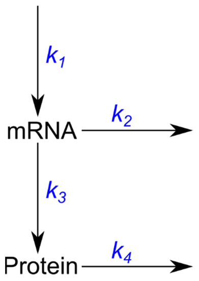 In this simple model, and correspond to transcription rates and translation rate constants, and and to degradation rate constants of mRNAs and proteins, respectively. This model can be represented mathematically as a kinetic model in terms of ordinary differential equations (ODEs) as follows: