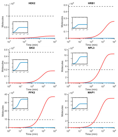 The models considering HRB1, HEK2, and SKI2 predict two to five-fold lower final steady state levels than measured (‘benchmark’) average protein abundances. Specifically, Hrb1p is predicted to have a protein abundance of 2543 protein copies per cell, while the known abundance is 4794; Ski2p is predicted to have 1811 proteins, while the benchmark is 4623; and Hek2p is predicted at 997, while the target is 10,029 (Figure 2). Conversely, it overpredicts the steady state abundance levels of Npl3p, Pfk2p, and Map1p by 2–4 fold. Npl3p reaches a predicted abundance of 104,800 molecules per cell, as compared to the benchmark of 47,816; Pfk2p is predicted at 371,960, while the benchmark is 94,449, and Map1p is predicted to have 88,001 copies, while it is expected to have 15,176. This suggests that, with the parameter values given in Table 1, the topology considered in Model 1 is unable to correctly reproduce estimates for steady states values (Figure 2).